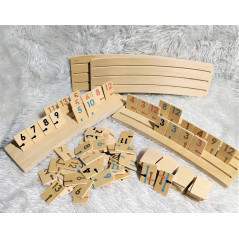 -104 planchettes bois, couleurs: doré, vert d'eau, noir, jaune, (numérotées avec des motifs) dim: 3,8cm x 2,5cm