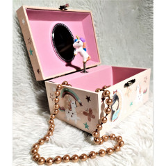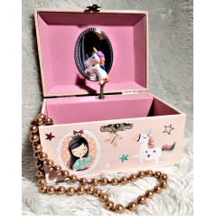 Très jolie boite musicale dans un ton vieux rose, saumon et vert d'eau, pour ranger les petits trésors ou bijoux. En tournant une petite manivelle placée au dos du coffre on fait danser la Licorne devant un miroir plastifié. Petite figurine tourne au rythme de la mélodie "Licorne" de Lolo Schifrin et enchante nos petits avec ses mouvements doux et ses couleurs pastel. L'intérieur du coffret est tapissé d'un velours pour la protection des objets fragiles.